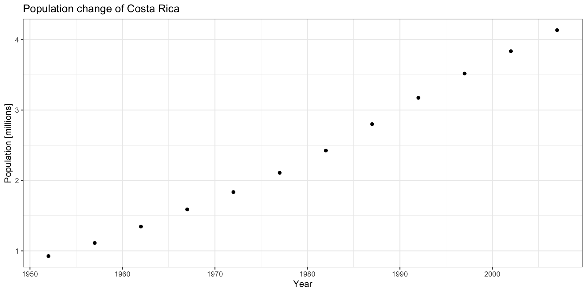 response <- httr::GET(URLencode("http://127.0.0.1:1234/pop_country_change_df?country=Costa Rica"))jsonlite::fromJSON(rawToChar(response$content)) |> tibble::as_tibble() |> ggplot2::ggplot() + ggplot2::geom_point(ggplot2::aes(x = year, y = pop /1E6)) + ggplot2::labs(x ="Year", y ="Population [millions]", title ="Population change of Costa Rica") + ggplot2::theme_bw()